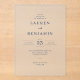 This wedding invitation features a minimalist and elegant design with a clean, white background that emphasizes clarity and simplicity. The layout is symmetrical, creating a balanced and formal appearance, while the use of serif fonts adds a touch of tradition to its contemporary feel. The typography guides the eye smoothly from top to bottom, highlighting the customizable names and date in bold, ensuring all essential details stand out. Perfect for couples seeking a classic yet modern aesthetic, this invitation sets the tone for a sophisticated celebration.