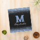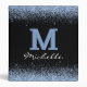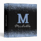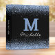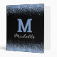 Personalized monogram binder featuring a black background that can be changed to any color, a pale blue glitter waterfall overlay, your initial, and name in a elegant script typeface.