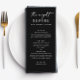 Set the tone for a stylish evening with this black rehearsal dinner menu card. Featuring a bold black background, elegant script header, and modern serif layout, this design is perfect for formal, minimalist, or black-tie events the night before your wedding. Customize with your own meal selections and details for a cohesive and sophisticated table presentation. Pairs beautifully with modern wedding stationery and monochrome event themes.