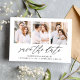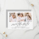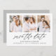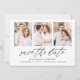 Announce your upcoming nuptials in style with our Elegant Script photo save the date card. The elegant save the date cards display 3 of your favorite engagement photos framed in white with "save the date" in a black, modern calligraphy script. Personalize the card by adding your names, wedding date, and wedding location. The minimalist save the date card reverses to a solid gray background or a color of your choice.