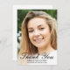 Send an elegant custom photo graduation thank you flat card to family and friends featuring a photo on the front with black script calligraphy overlay which reads "Thank You" with your name, school and year below to personalize. The back of the card has a thank you note and signature for you to personalize accented by a black graduation cap. Congrats on your graduation. Designed by artist Susan Coffey.