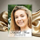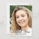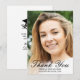 Send an elegant custom photo graduation thank you flat card to family and friends featuring a photo on the front with black script calligraphy overlay which reads "Thank You" with your name, school and year below to personalize. The back of the card has a thank you note and signature for you to personalize accented by a black graduation cap. Congrats on your graduation. Designed by artist Susan Coffey.