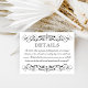 Share important event information with this sophisticated details enclosure card featuring ornate black scrollwork flourishes on a crisp white background. The classic design showcases an elegant "Details" header framed by intricate Victorian-inspired scroll borders with body text in a flowing calligraphy script. Perfect for communicating adults-only policies, dress code, parking directions, or any other wedding day specifics your guests need to know. All text is fully editable.