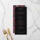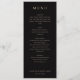 This elegant wedding menu features a classic, vertical layout with a sophisticated black background and crisp white text. The design uses a clean serif font to create a formal and refined atmosphere, with sections clearly marked for starters, salad, main course, and dessert. Each dish is presented in an easy-to-read format, enhancing the overall sense of luxury and simplicity. Perfect for a formal event, this menu exudes elegance and sophistication, making it ideal for couples seeking a timeless and stylish presentation for their special day.