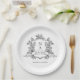 Classic black and white floral crest wedding paper plate with monograms, perfect for a modern classic or romantic vintage wedding. For more advanced customization of this design, please click the BLUE DESIGN TOOL BUTTON above! Matching items are also available.