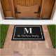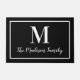 Freshen up your home's entrance with this elegant custom monogram doormat in classic black and white colors. Note, colors can be modified. Personalize with your family's last name in script and a serif style monogram initial. Design includes a simple framed border.