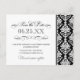 A crisp and striking save the date postcard featuring a bold black damask medallion and tiled side panel against a clean white background. The ornate scrollwork script typography adds a refined, formal touch perfect for black-tie or classic ballroom celebrations. Personalize all names, date, location, and website details to make it your own.
