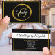 This elegant design features a background on both sides with gold and white elements including a calligraphy circle on the front for name and initial letter monogram. The back holds the business name and information including full name and occupation. Fill in the template fields or click customize to select a typeface style, size, and color you like.