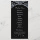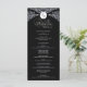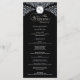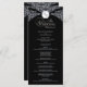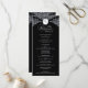 This wedding program features a bold black background framed with ornate white damask flourishes, giving it a formal and timeless style. At the top, a decorative crest displays the initials, while the center of the design presents the couple’s names and all wedding service details in a clean, organized layout. The contrast of black and white creates a striking look that emphasizes elegance and sophistication, making it a perfect choice for traditional or evening weddings.
