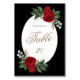 Beautiful watercolor floral sprays... with gorgeous red peonies, lush greenery, eucalyptus, and baby's breath... surround an oval frame with your table number in gold typography script. The rich reds and greens in the florals set off the elegant black, white, and gold backgrounds. Add your own details by following the "Personalize" link. If you would like assistance, please reach out to me via message here on Zazzle or email. susanmingaydesigns@gmail.com