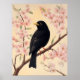 A striking blackbird perches gracefully on a cherry blossom branch, its dark feathers contrasting beautifully with the soft pink flowers. The scene captures the essence of spring with a delicate balance of nature and elegance.