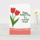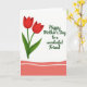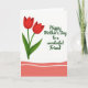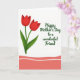 On the front of the card a digital illustration pairs botanical charm with a polished, airy look. Two stylized tulip-like flowers sit prominently on the left, their petals a deep red with gentle shading that suggests a tender, affectionate warmth ❤️. Slender green stems and a few curved leaves sweep upward, as if leaning toward the message like a friendly gesture. On the right, a celebratory greeting appears in flowing lettering, set in a fresh leafy green that matches the foliage. The words are placed with generous spacing on the white background, giving the design a calm, open feel 🌼. The background stays bright white so the red and green stand out clearly without crowding the page. Along the bottom, a wide coral wave runs across the card, traced with thin white stripes that follow its soft curves.