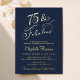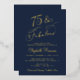 Elegant dark blue 75th birthday party invitation featuring "75 & Fabulous" in a chic calligraphy script and the party details in simple modern lettering, all rendered in your choice of genuine gold, silver or rose gold foil.