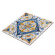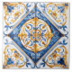A vibrant and detailed tile design features intricate floral motifs in shades of blue and gold, creating an elegant centerpiece.