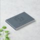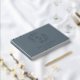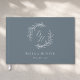 Custom-designed steel blue and silver foil wedding guestbook featuring modern elegant foliage wreath monogram with personalized couple's initials, name, and wedding date.