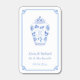 This classic design features a classic watercolor blue and white Ginger Jar with a single letter monogram. Underneath this is the personalized text including names of the couple and the date of the event. The design also has a Greek Key border, of which you can change the contrast color (currently a mid blue) by entering the design tool ("click to customize further" underneath the text customization boxes) and changing the background colors.
