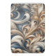 Elegant baroque-inspired swirl design in warm beige, ivory and deep blue tones.