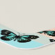 Cartoon Cute Elegant Blue & Black Butterfly with pastel blue peach orange green and purple horizontal stripes ombre background. Cute pretty Simple fun design.