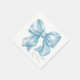 A charming cocktail napkin design featuring a large watercolor blue bow at a cute angle in the center. The mom to be's name is displayed in a classic serif font in the lower right corner, with "Baby Shower" elegantly written below in handwritten script calligraphy.