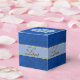 Elegant wedding favor box done in a royal blue textured looking damask background. Graphics of a gold edged transparent ribbon, around the box, has golden graphic text reading Love. The top of the box has a decorative gold dotted framed text plaque, with black custom text ready to personalize. Lovely little gift box for candies and anything else you want to give your guests.
