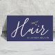 Elegant customizable business card template with FAUX copper scissors icon /dark blue background and handwriting text. Modern clean design, perfect for hair stylist, hairdresser.