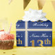 This simple and elegant wrapping paper design features a personalized message like "Name-Here’s 13th Birthday" (with the "13th" having a faux/imitation gold-like coloring look) within a blue-colored square area featuring a simple border outline. The name is in an elegant white-colored script-like text, and can be customized. Wrapping paper like this could perhaps be used when wrapping birthday gifts for somebody who is celebrating their thirteenth birthday. [~Z0000221]