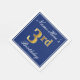 This simple and elegant paper napkin design features a message like "Name-Here’s 3rd Birthday" (with the "3rd" having a faux gold-like coloring) within a blue-colored square area featuring a simple border outline. The name is in white-colored script-like text, and can be customized. Napkins like these could perhaps be used at a birthday party for somebody who is celebrating their third birthday. [~Z0000141]