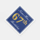 This simple and elegant paper napkin design features a message like "Name-Here’s 67th Birthday" (with the "67th" having a faux gold-like coloring) within a blue-colored square area featuring a simple border outline. The name is in white-colored script-like text, and can be customized. Napkins like these could perhaps be used at a birthday party for somebody who is celebrating their sixty seventh birthday. [~Z0000141]