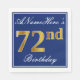 This simple and elegant paper napkin design features a message like "ANameHere’s 72nd Birthday" (with the "72nd" having a faux gold-like coloring) within a blue-colored square area featuring a simple border outline. The name is in white-colored script-like text, and can be customized. Napkins like these could perhaps be used at a birthday party for somebody who is celebrating their seventy second birthday. [~Z0000141]