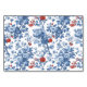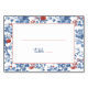 This elegant wedding place card features a rectangular frame with a floral border, showcasing large blue roses and smaller red flowers accented by green leaves. The clean white background highlights the vibrant color palette of deep navy blue and bright red, creating a striking contrast. The design includes customizable placeholders for names and table numbers, set in an elegant cursive font that adds sophistication. Perfect for formal events, this card combines traditional botanical elements with a modern twist, conveying a mood of refinement and celebration.