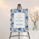 This elegant wedding poster features a classic floral design with large blue flowers and white accents, creating a harmonious and balanced composition. The color palette is dominated by deep blues complemented by lighter shades, giving it a vintage feel. The central text area showcases customizable names and date in bold serif fonts, framed by a thin blue border that matches the floral motif. Perfect for adding a touch of sophistication to your wedding celebration, this design conveys a formal and celebratory mood ideal for inviting guests to a memorable event.