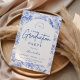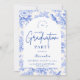 An elegant graduation celebration design featuring a delicate blue toile floral border inspired by classic European porcelain and vintage botanical prints. The intricate florals frame a clean arched center panel, creating a refined and timeless composition that highlights the graduate’s name and event details beautifully. Soft blue tones against a crisp ivory background give the design a sophisticated yet celebratory feel. Perfect for a stylish graduation gathering with a classic, romantic aesthetic.