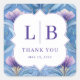 This elegant wedding sticker features a symmetrical floral design with a deep blue background and intricate white frame, creating a luxurious focal point. The rich purple initials "L | B" are prominently displayed in bold serif font, surrounded by stylized flowers and swirling leaves in shades of light to medium blue with lavender accents. Below the initials, the phrase "THANK YOU" is written in a matching serif font, adding a touch of gratitude to the design. The overall aesthetic blends traditional botanical illustrations with modern graphic elements, conveying a serene and sophisticated mood perfect for formal celebrations.