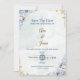 Invite your guests to mark their calendars with this elegant "Save the Date" card featuring soft blue watercolor florals, gold ornamental corners, and modern typography. Ideal for classic or romantic wedding themes. Customize with your names, date, and location easily.