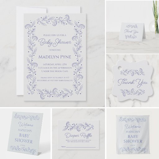 Complete your baby shower invitations with this elegant blue floral and vine themed diaper raffle enclosure card. The simple and elegant hand drawn design is the perfect match for a baby shower invitation.