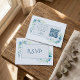 A small, refined wedding RSVP card adorned with soft blue watercolor florals and elegant typography, designed to bring a touch of romance and sophistication to your celebration. The front presents a classic “R.S.V.P” layout framed by delicate botanical accents, setting a graceful, inviting tone for your guests. On the back, a convenient, scannable QR code is paired with clear reply instructions, offering a seamless, modern method for responding. This card coordinates perfectly with the full blue floral wedding suite, ensuring your stationery is cohesive and beautifully tailored from first impression to final detail. Ideal for couples seeking effortless elegance and interactive guest engagement.