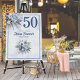 This beautifully designed 50th birthday sign features a soft blue marble background with an elegant floral arrangement in blue and white placed in the upper left corner. A refined serif and graceful script font combination presents your celebration details in style, all enclosed in a tasteful border. The bold number 50 stands out, marking this special milestone with prominence.