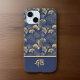 Lovely golden ginkgo leaves grace this dark blue gray background, creating an elegant, organic pattern for thi beautiful iPhone and Samsung cell phone case. Your initials appear in gold against a blue background at the bottom. Make sure to type your initials in the Personalize section.