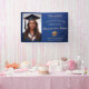 This graduation banner has a deep blue textured background and elegant white or silver text. The banner allows for a customizable name line, name of the university attending, and a photo.