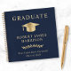 Elegant dark blue graduation party guest book featuring a gold grad cap, "Graduate" and the graduate's name, school and class year in classic serif typography.