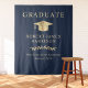Elegant dark blue graduation party welcome tapestry and photo booth backdrop featuring a gold grad cap, "Graduate" and the graduate's name, school and class year in classic serif typography.