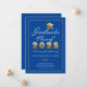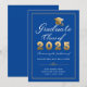 Announce your graduation in style with this elegant custom announcement card featuring a typography design with the words "Graduate Class of 20XX" accented by a faux gold graduate cap on an blue background with personalized text in white script. Designed by Susan Coffey.