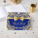 Blue and gold guest book with gold jewel bow on an elegant royal blue and gold swirl background. You can easily customize this beautiful royal blue and gold guest book for your event by simply adding the text of your choice in the font style you prefer. This is a printed design with no real bows, jewels, etc.