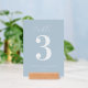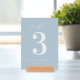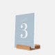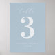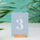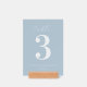 This elegant wedding table card features a minimalist design with a muted blue-gray background, creating a calming and sophisticated atmosphere. The layout is vertically oriented, highlighting the large numeral "3" in bold, sans-serif typography at the center, surrounded by ample negative space for a clean look. Delicate cursive script crowns the top with the word "table," while simple serif fonts present customizable name and date placeholders below, ensuring personalization for any event. The overall style exudes understated luxury, perfect for formal occasions where a refined presentation is desired.