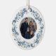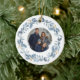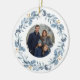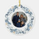 Elegant Christmas ceramic ornament featuring a blue watercolor wreath and your family photograph. On the back it can be personalized with your family name, as well as the year.