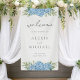 Modern elegant wedding welcome sign featuring blue hydrangea watercolor floral design.