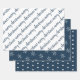 An elegant set of three coordinating wrapping paper sheets in a deep blue and ivory color palette. One has Merry Christmas written in a modern handwritten font. The second features an abstract Christmas tree pattern and the third sheet has a snowflake pattern.