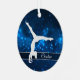 This elegant ornament features a silver silhouette female gymnast in a handstand against a pretty blue background with tiny star lights. Her name is in silver on a semi transparent banner that is framed in white faux glitter. The back of the ornament has the same blue background with three custom text fields at the center. Perfect for that daughter, granddaughter, or niece who is a ballet dancer.