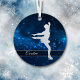 This elegant ornament features a silver silhouette female ice skater against a pretty blue background with tiny star lights. Her name is in silver on a semi transparent banner that is framed in white faux glitter. The back of the ornament has the same blue background with three custom text fields at the center. Perfect for that daughter, granddaughter, or niece who is a skater.