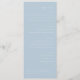 This elegant wedding menu features a minimalist design with a soft pastel blue background and white text, creating a serene and sophisticated atmosphere. The layout is vertically oriented with centered alignment, using a combination of cursive and sans-serif fonts for a touch of formality and clarity. Generous spacing between sections highlights each category distinctly, while the understated color palette and simple typography emphasize elegance and refinement. Perfect for formal occasions, this design focuses on readability and order, making it ideal for couples seeking an uncluttered yet stylish presentation for their special day.